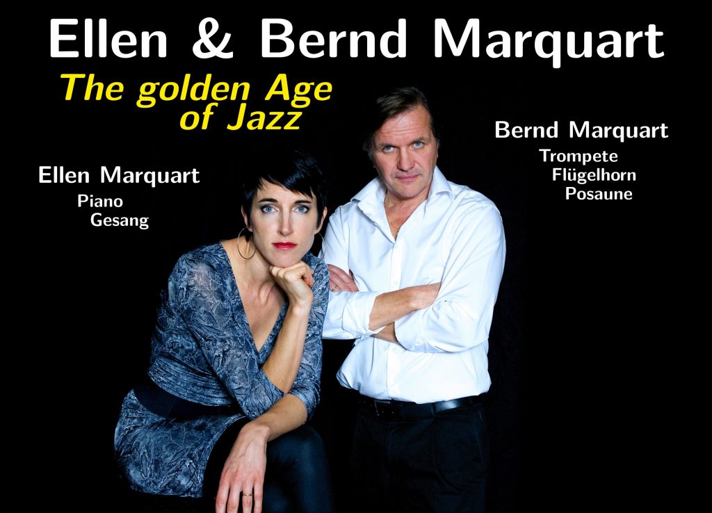 Das deutsch-amerikanische Jazz-Duo Ellen Marquart, Piano und Gesang, und Bernd Marquart, Trompete und Flügelhorn, bringt es auf den Punkt. Diese beiden fantastischen Musiker agieren einfach mitreißend. Sie entführen ihr Publikum mit klassischen Jazztiteln und swingenden Eigenkompositionen in die amerikanische Glamour-Welt des Jazz mit aktionsreichen und abwechselnden Arrangements, die ihr stimmliches und instrumentales Können überzeugend zum Ausdruck bringen, und ihr perfektes Zusammenspiel gekonnt präsentieren. Ellen begeistert ihre Zuhörern mit einer Stimme, die zwischen Ella Fitzgerald und Norah Jones angesiedelt werden kann. Vervollkommnet wird dieser Wohlklang von Bernd Marquarts virtuosem Trompeten- und Flügelhornspiel. Er begeistert mit einem stark ausgeprägten eigenen Stil, der Spannung durch musikalische Gegensätze erzeugt. Traditionelle Spielweisen werden mit moderne Phrasen kombiniert. Auf lyrische Melodiebögen folgen rasant-schnelle Linien. Das starke Fundament für ihre Musik ist Ellens linke Hand, die deutlich vom swingenden Drive der Stridepianisten des Urjazz inspiriert ist. Die Marquarts, die von der Stuttgarter Zeitung als das romantischste Jazzpaar beschrieben wurden, zeigen, wie man zu zweit auf höchstem Niveau musiziert. „Klassischer Jazz vom Feinsten.“ ~Welt am Sonntag „Sechs richtige mit Zusatzzahl…“ ~Der Spiegel